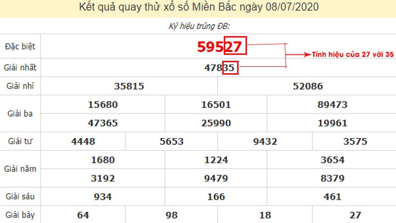 VD: Giải đặc biệt của ngày 8/7/2025 là 59527, giải nhất là 47835. Hiệu số là 27 – 35= -8, vậy thì ngày hôm sau bạn hãy đánh ngay cặp lô 08 – 80, chắc chắn sẽ về.